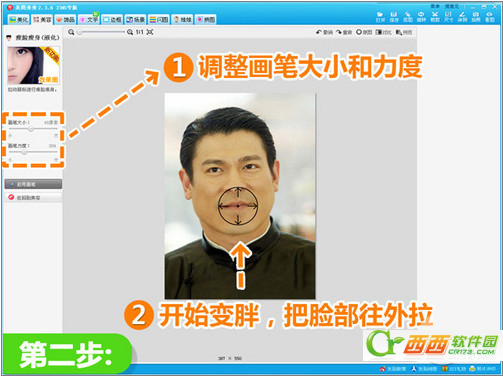 2、先调整画笔的力度和大小,然后开始对人物脸部进行拉伸,变胖。