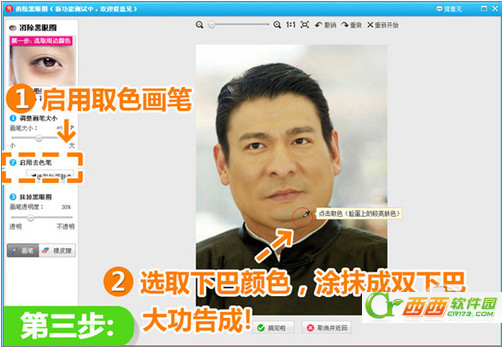 3、变胖之后,需要再用“美容”菜单中的“去除黑眼圈”功能,涂抹一个双下巴,这样才更加逼真。