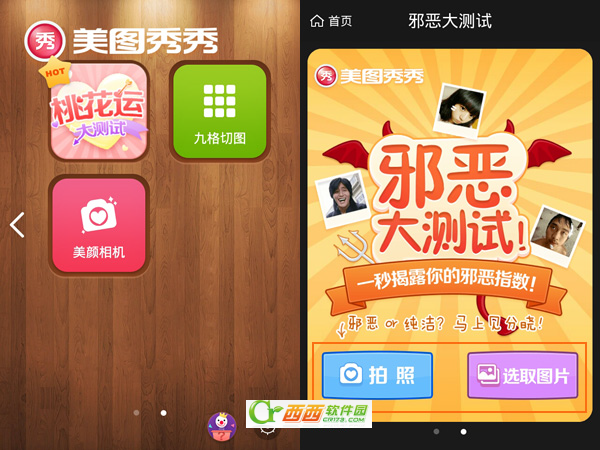首先我们更新美图秀秀软件到最新版,打开美图秀秀之后,在首页界面中点击“桃花运测试”,进入之后除了桃花运测试外,还有一个邪恶大测试,在邪恶大测试中,用户可以拍照或者从相册中选取图片。