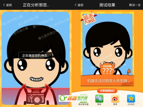 添加完图片后,美图秀秀会自动测试你的邪恶值,不到一会美图秀秀就会得到结果了,但经小编测试,用真人的图片才能测试成功的,测试完成后,如果觉得自己很邪恶,还可以把成绩分享给更邪恶的好友喔。